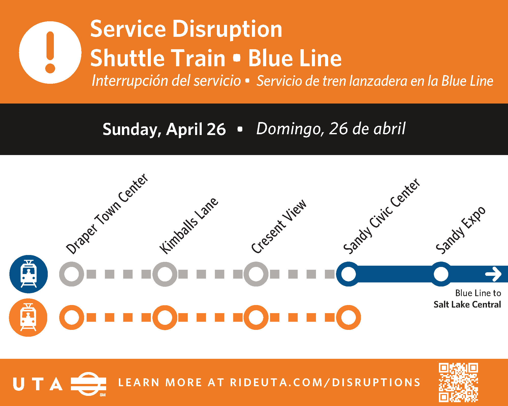 - Plan for delays of up to 15 minutes between Sandy Civic Center Station and Draper Town Center Station for those taking the shuttle train.